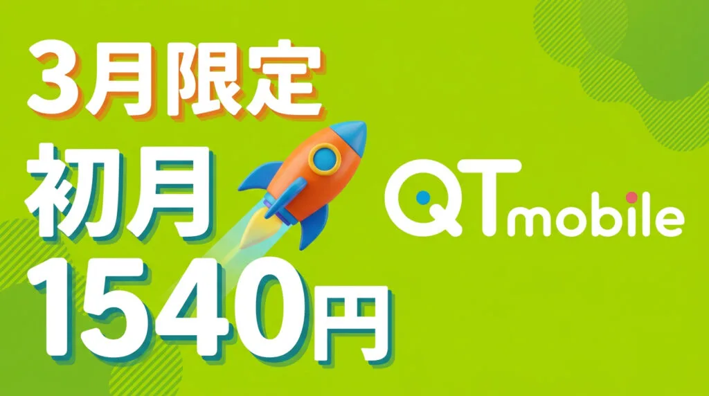 QTモバイル紹介。3/31まで事務手数料無料。SIM発行手数料と維持費の合計1540円で音声SIMが持てる。