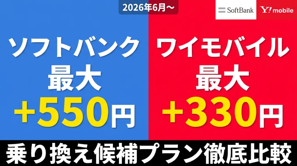 ソフトバンクとワイモバイルが6月2日から値上げって本当? 最大月550円上がる。そろそろ乗り換え先を決める時。 はじめに 2026年4月10日、ソフトバンクとワイモバイルが2026年6月2日からの料金改定(値上げ)と新プラン提供開始を発表しました。既存ユーザ...