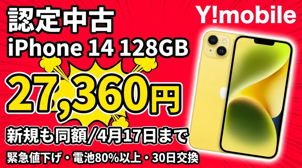 ワイモバが認定中古iPhone 14を緊急値下げ。 新規契約でもMNPと同額の27,360円。4/17(金) 9:59までの1週間だけ。 はじめに 2026年4月10日にワイモバイルの「ソフトバンク認定中古品」で、iPhone 14 128GBが一括27,360円に値下がりしました。通常時の新規価...