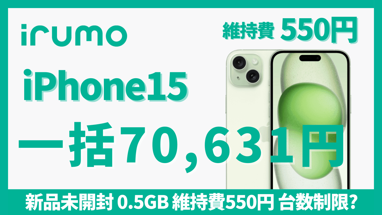 ソフトバンクオンラインでiPhone15が63,408円で売られていますが、スマホデビュープランが使えない場合に割高なプランしか選べず維持費が嵩んでしまう事がデメリットでした。しかしirumoを選べば機種代金こそソフトバンクオンラインに負けますが維持費は驚異の550円/月で運用することが可能です。