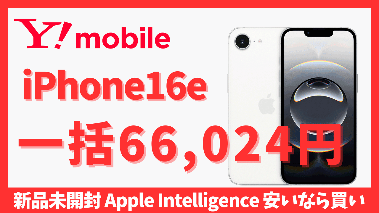 ワイモバイルで他社からの乗り換え(MNP)でiPhone 16e(128GB)が一括66,024円で購入できます。Apple Storeで直接購入すると99,800円のため断然お得。ワイモバイルのSIMも手に入るので通信費の見直しや家族用にもつかえます。ちなみに契約した後に更に新規契約でSIM単体申し込みすると+20000ポイントもらえます。