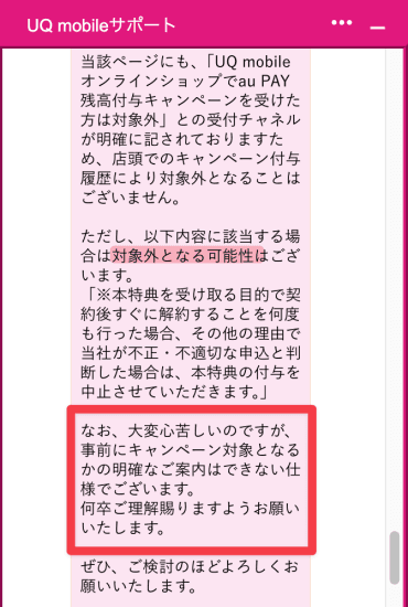 「過去にUQ mobileオンラインショップでau PAY残高が付与されるキャンペーンの適用をすでに受けた方は本キャンペーンの対象外となる場合があります」と記載されています。何とも絶妙な言い回しです。適用されるか不安な場合は、申し込み前にUQ mobileに問い合わせてみましょう。【追記】実際に問い合わせましたが対象かどうか教えてくれませんでした。言い回しのニュアンスからあまりに悪質で無い限りは大丈夫な気もします。実際に試していけるかどうか分かり次第また追記します。