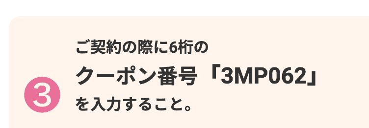- ご契約の際に、6桁のクーポン番号「3MP062」を入力すること。