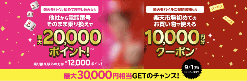 | MNP(番号そのまま) | 20,000ポイント | 利用開始16,000pt+楽天市場利用4,000pt | 10,000円分(1,000円OFF×10枚)※未経験者のみ | 最大30,000円相当 |