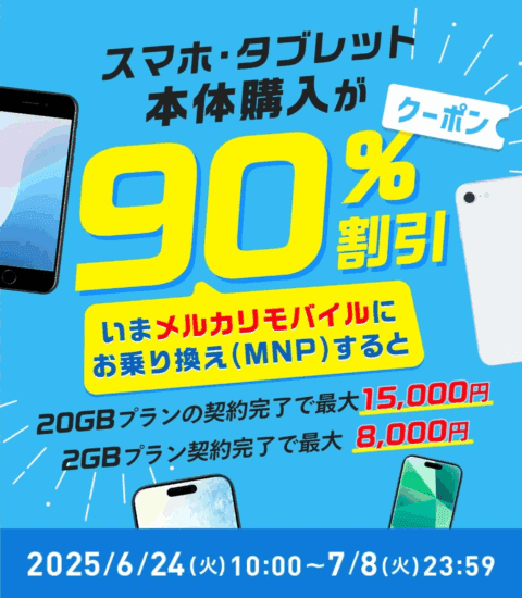 以前、メルカリモバイル契約で最大15,000円分メルカリ販売スマホが割引になるキャンペーンが実施されていました。現在は終了していますが、今後も同様のキャンペーンが開催される可能性があります。