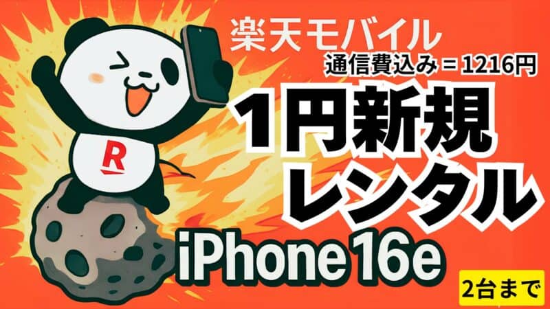 大手通信キャリアが軒並み料金値上げを実施しまくる中、ようやく一段落したかなというタイミングで楽天モバイルが衝撃的なキャンペーンを開始しました。iPhone16e 128GBをMNP/新規契約問わず月額1円で2年間レンタルできるというものです。しかも1人2台までOK。楽天最強プランなので通信費1,078円からでOK。間違いなく今年最大の祭りです。