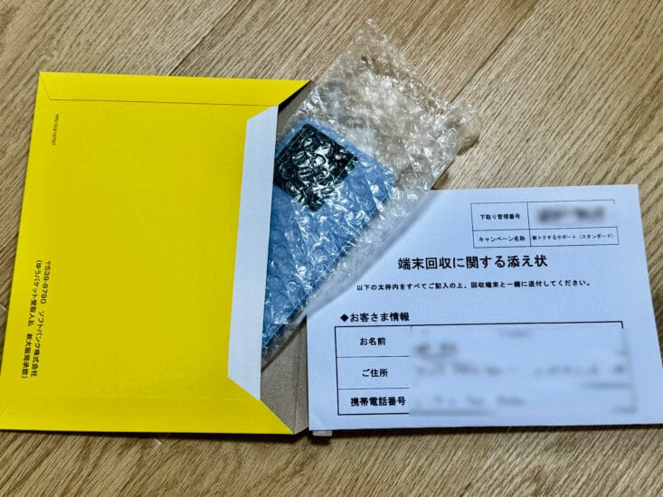 ソフトバンクの場合、こういう封筒に端末を入れて、直接ポストに投函して返却します。封筒は家電量販店またはソフトバンクショップで「新トクするサポート+の返却がしたいので返却キットをください」というともらえます。ソフトバンクオンラインで請求することも可能です。au,docomoも流れは同じです。