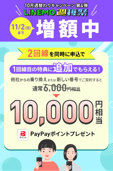 LINEMOを申込する際に、2回線を家族を使用者登録して契約する場合、「2回線まとめて申し込みでPayPayポイントプレゼントキャンペーン」により新規契約でも10,000円相当(通常6,000円 + 期間限定4,000円)が付与されます。(11/2まで)