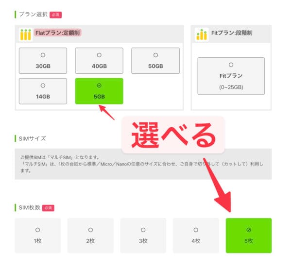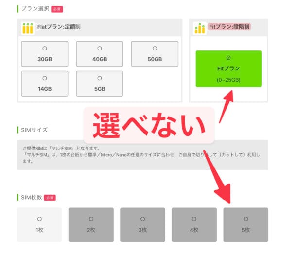 2025年10月15日現在、Fitプランの複数SIM申込は停止中です。複数SIMを申し込む場合は「Flatプラン 5GB以上」を選択してください。