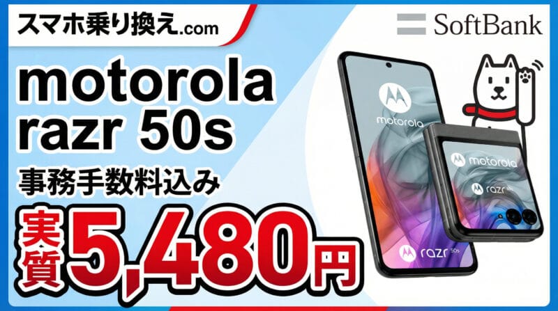 先日のXperia 10VI 9,824円+2万CBを超えるキャンペーンが来ました。ソフトバンク代理店「スマホ乗り換え.com」で、motorola razr 50sが一括19,760円、さらに20,000円のキャッシュバックがもらえます。