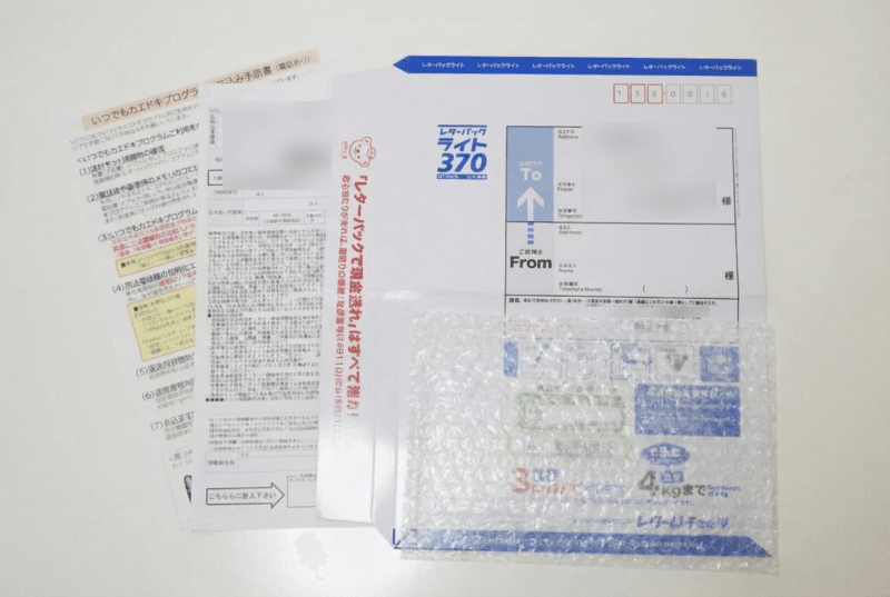 ドコモの場合こういった封筒に端末を入れてポストに投函することで返せます。My docomo(Web)もしくは、ドコモショップ/d garden、ドコモ取扱店でもらう事ができます。申請する方法は公式サイトを参照してください。よくわからない場合、2年後にドコモショップに行って「いつでもカエドキプログラムのスマホを返却したいです」と言えば教えてくれます。