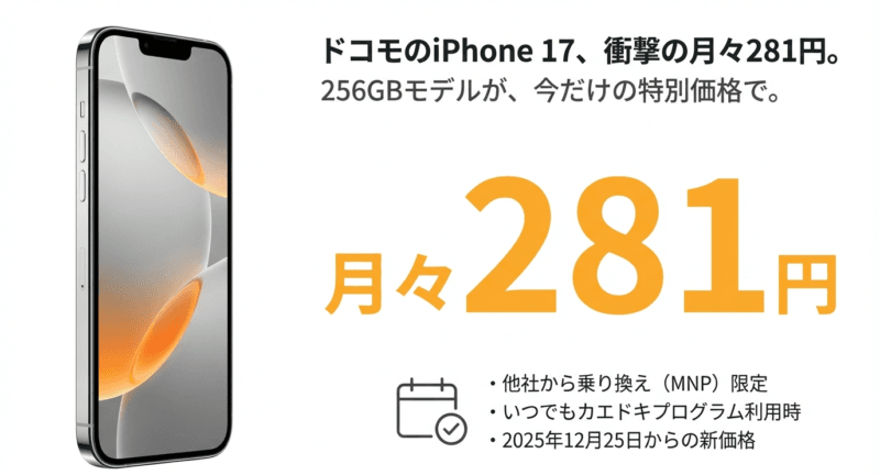 2025年12月25日、ドコモオンラインショップとahamoでiPhone 17とPixel 10の大幅値下げが発表されました。「いつでもカエドキプログラム」を利用したMNP契約で、iPhone 17(256GB)が月額281円という信じられない価格になっています。これは全キャリアで見ても過去最安値となっています。