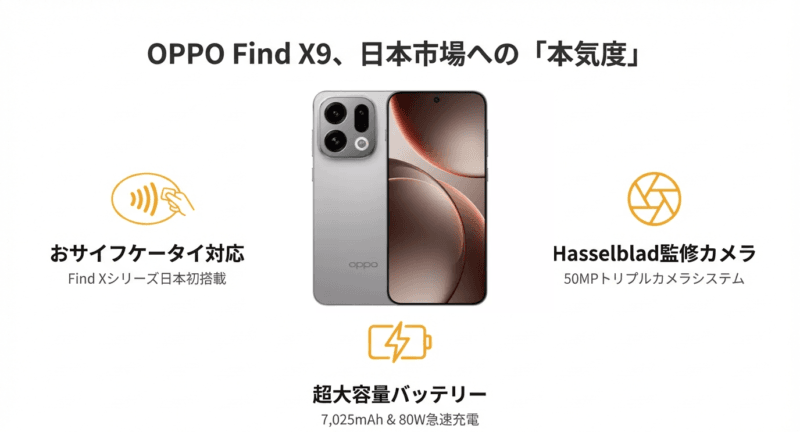 OPPO Find X9は、16GB RAM/512GBストレージを搭載したハイエンドスマートフォンです。日本版の最大の特徴はおサイフケータイ(FeliCa)対応で、OPPOのFindシリーズとしては初めての対応となります。