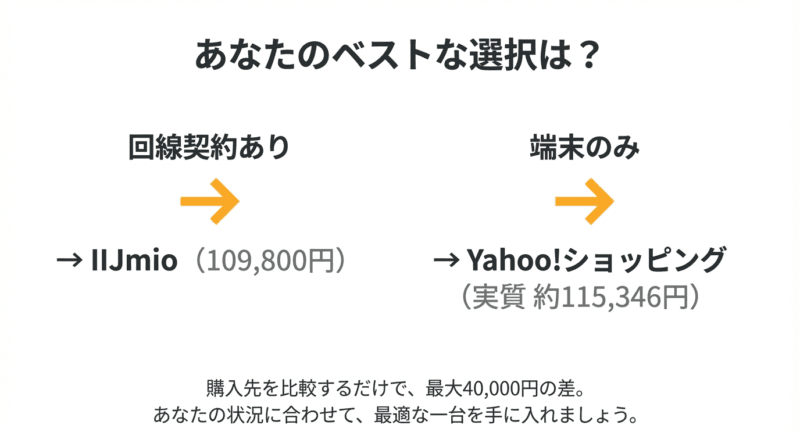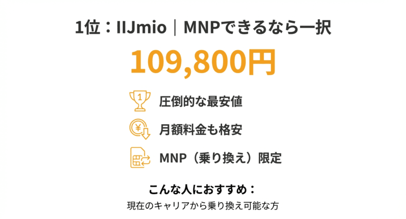 回線契約を伴うMNPではIIJmioとauが圧倒的に安く、端末のみ購入ならYahoo!ショッピングのポイント還元が最もお得です。