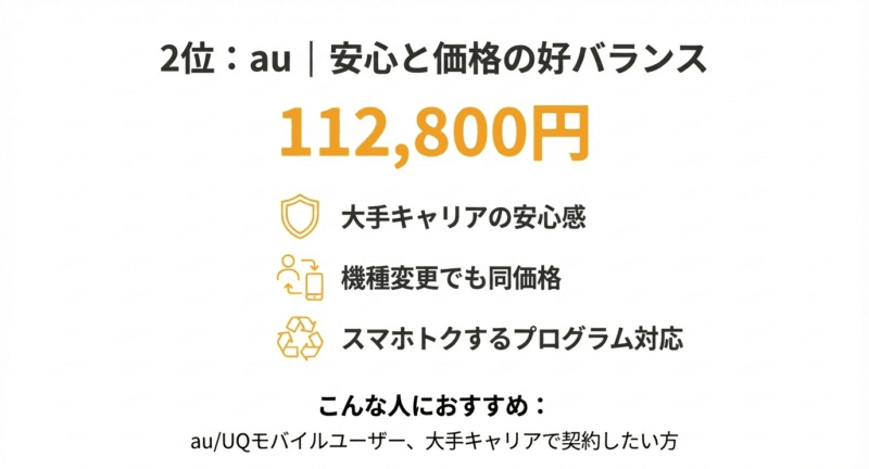 au公式オンラインショップでは、MNP・UQモバイルからの番号移行・機種変更のいずれかで112,800円になります。新規契約の場合は123,800円とやや高くなるため注意が必要です。