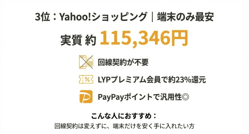 回線契約なしで端末のみ購入する場合、Yahoo!ショッピングのヤマダデンキ店が最もお得です。LYPプレミアム会員なら約23%のポイント還元が受けられます2025/12/27現在、ポイント倍率が13%に下がってしまいました。最新の倍率は公式Yahoo!ショッピングでご確認ください。