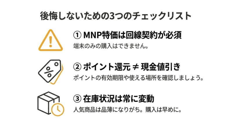 IIJmioやauの安価な価格は、回線契約(MNP)が必須条件です。端末のみの購入はできないため、現在の回線を解約または乗り換える必要があります。最低利用期間や解約金の有無も事前に確認しましょう。