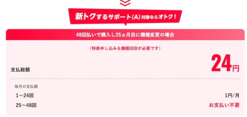 支払い方法で「新トクするサポート(A)」(48回払い)を選択します。これにより25ヶ月目以降に端末を返却すると、残りの支払いが免除されます。