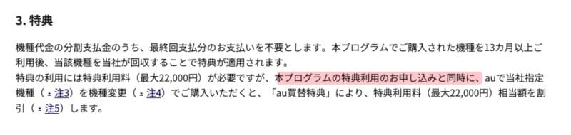auは特典利用申し込みと「同時」に機種変更の必要があると書かれているのでより厳しいです。いずれにせよ22,000円は払うものと思っていたほうが良さそうです。