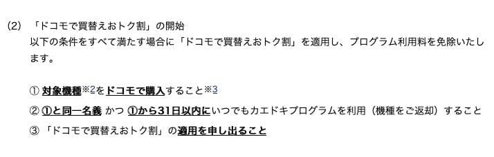 ドコモは端末返却後31日以内に同名義でドコモの対象機種を購入すると、利用料(最大22,000円)が免除されると書かれています。ただしMNPや新規契約は対象外のため「機種変更」で割高な機種を契約することになります。