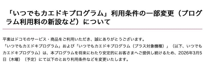| docomo | 2026年3月4日(水) | この日までに加入すれば旧条件のまま継続。翌5日から利用料最大22,000円の新制度へ |