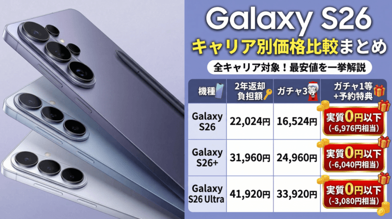 さらにソフトバンクはガチャキャンペーン(最大24,000円分)と予約特典(5,000円分)を組み合わせることで、実質的に0円に近い負担で最新のGalaxy S26を手に入れられる可能性があります。2年ごとに機種変更するサイクルの人はソフトバンクを第一候補に検討するとよいでしょう。
