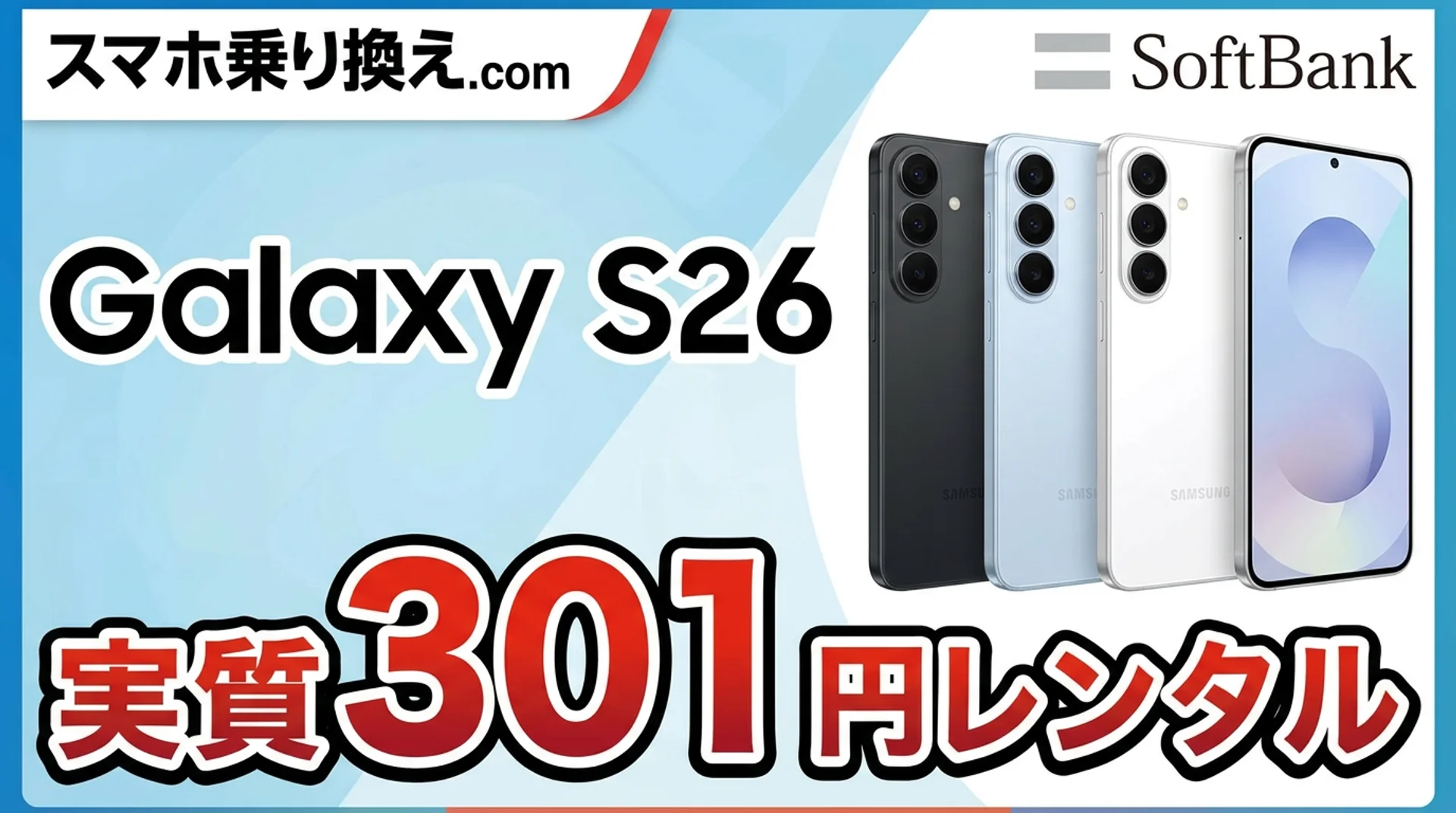 2026年3月12日発売のGalaxy S26を、ソフトバンク代理店「スマホ乗り換え.com」で購入すると公式より8,121円お得になるキャンペーンが始まりました。ソフトバンクの2年返却(新トクするサポート+)で22,024円のGalaxy S26に、代理店限定の10,000円キャッシュバックが上乗せされます。