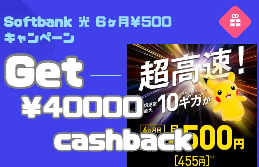 6ヶ月間ソフトバンク光が500円でしかも40000円もらえる。エヌズカンパニー経由。