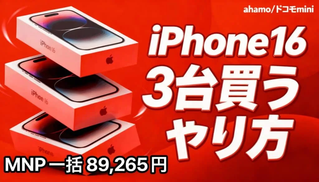 ドコモがiPhone16を一括89,265円で販売中。なぜかずっと売り切れないのでデータプラス技を駆使して3台買う方法を解説。維持費含めていくら掛かるのか。なおドコモminiなら維持費880円も可能。