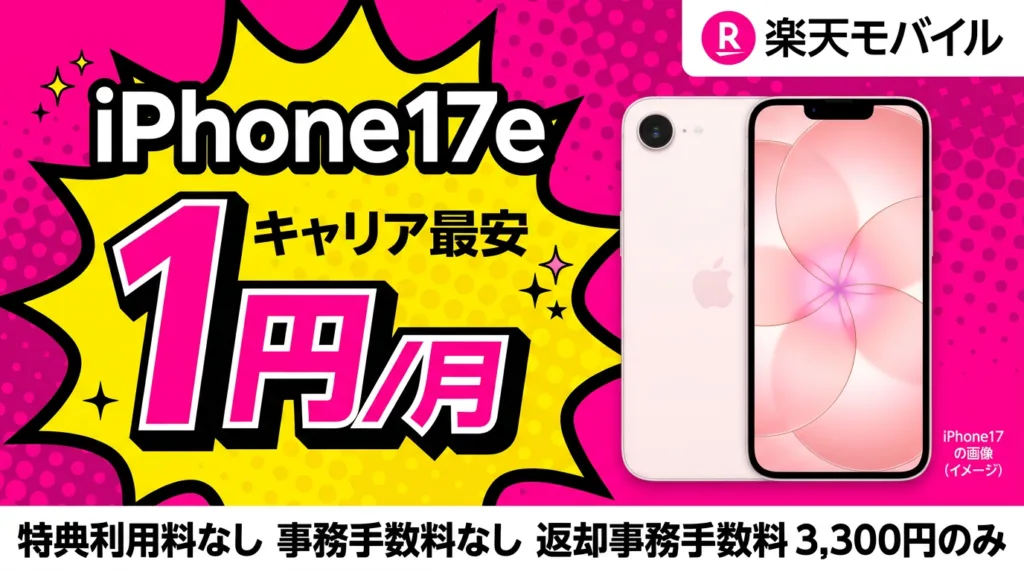 【最安】iPhone 17e 2年返却最安は楽天モバイル。24円、返却時手数料込み3,324円で買える。