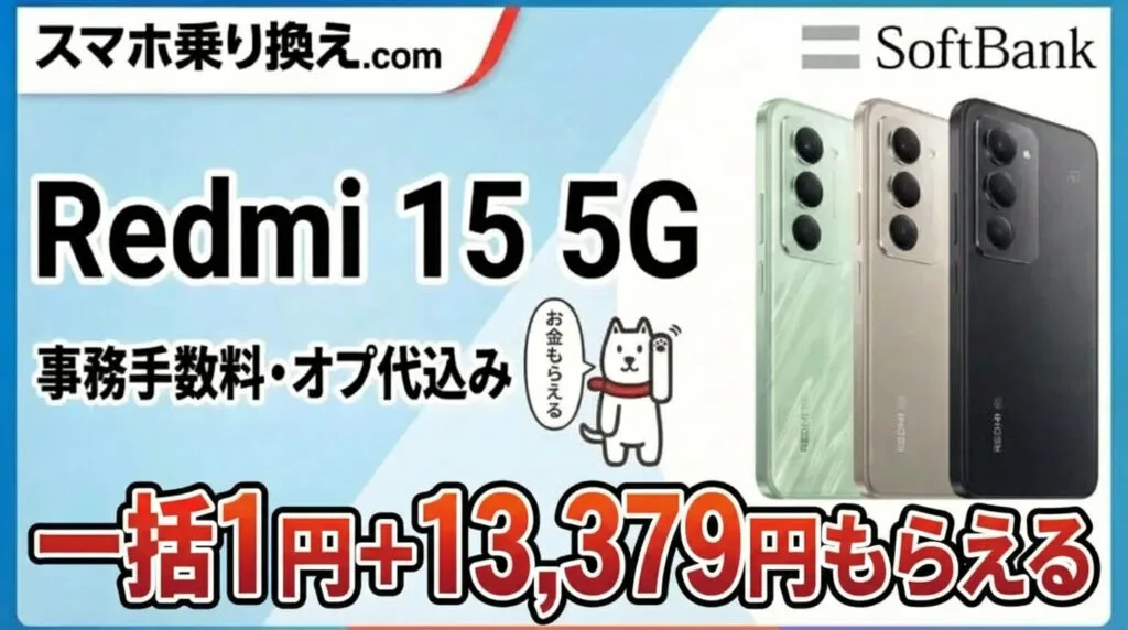 【1/31まで】Redmi 15 5Gが1円。しかも13,379円お金がもらえる状態へ。