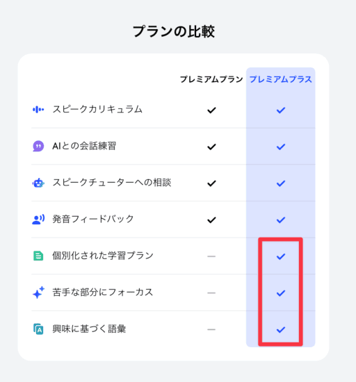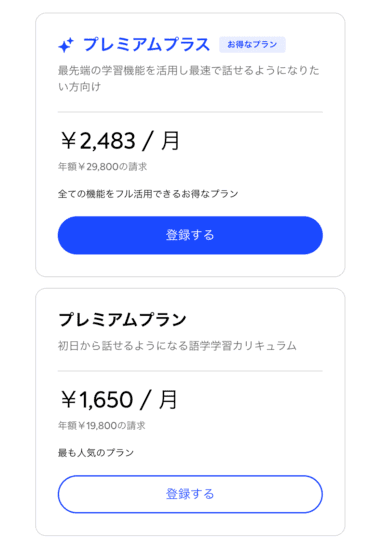 AIによる復習機能が無制限で使えるかどうかが違います。「間違えた部分」「もっとこう言えば自然になる」といったカスタム復習機能が無制限で使えます。これがかなり良い。ただ安いプレミアムプランも一日3回同じ機能が使えるので、一日1時間以上やるとかガチ運用しない限りプレミアムプランで良いと思います。