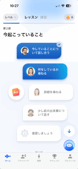 メインにはビデオレッスンが並んでいます。ここで解説を聞きながら練習して、スピーキングした内容をもとにAIが正誤を判断してくれます。ただこのアプリのすごいのはここからです。
