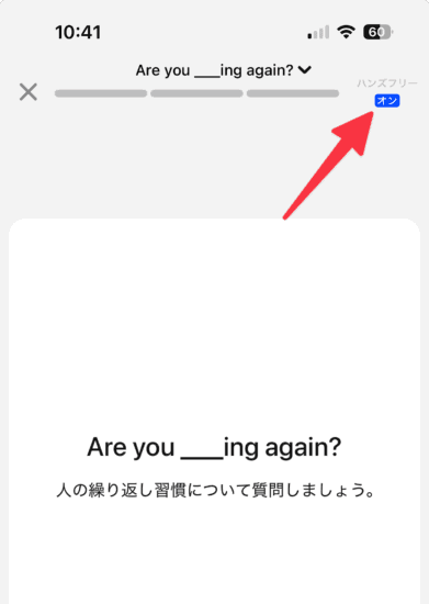 地味に嬉しいのがハンズフリー機能です。これをONにしておくとタップしなくても自動でレッスンが進むので、学習中ぼーっとして時間が過ぎてしまうことが無くなります。個人的にかなり嬉しいポイントです。